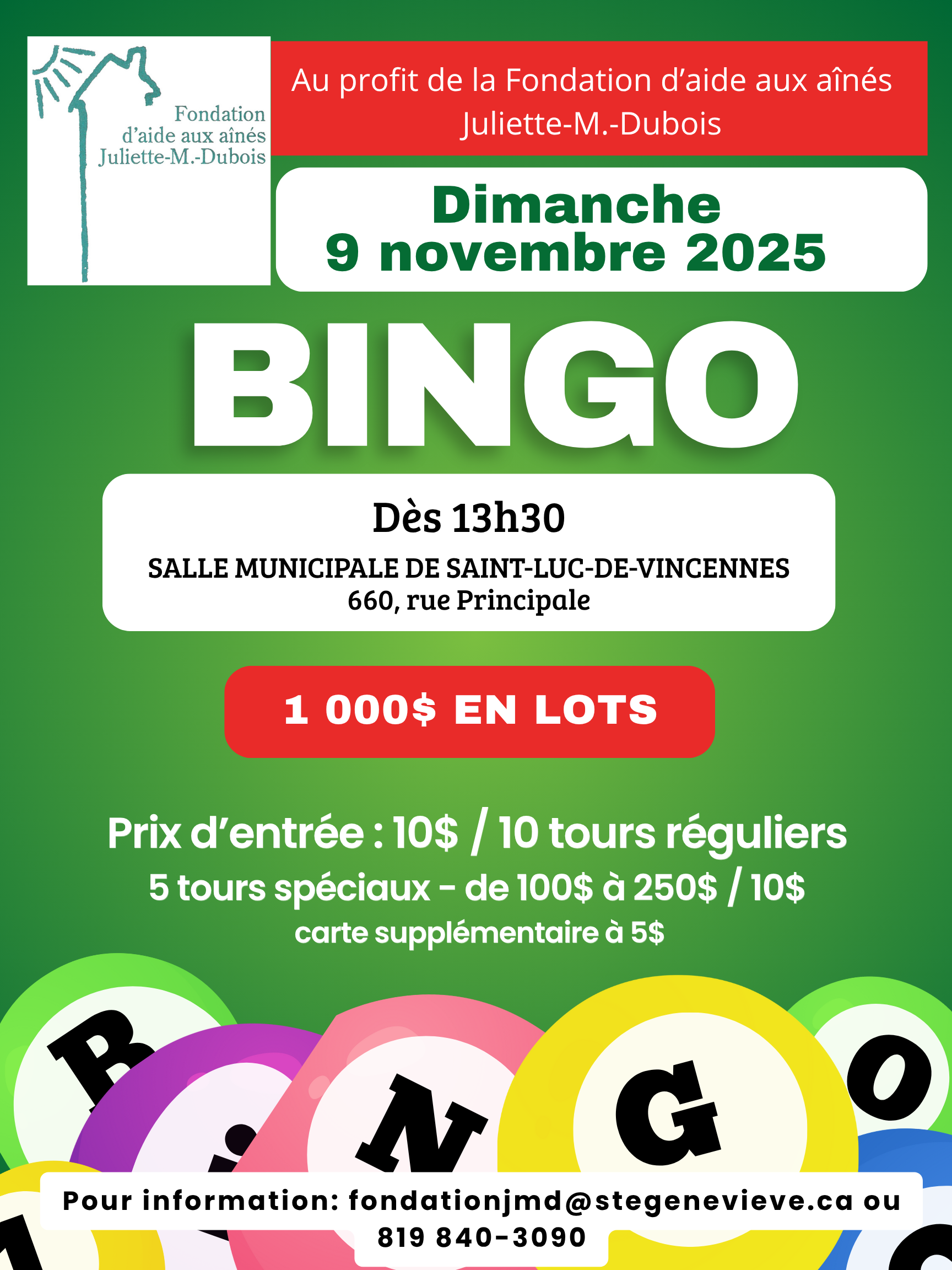 La fondation Juliette M-Dubois organise un nouveau Bingo ce dimanche! Venez vous divertir et jaser dimanche après-midi. Jusqu'à 1000$ en lots. |